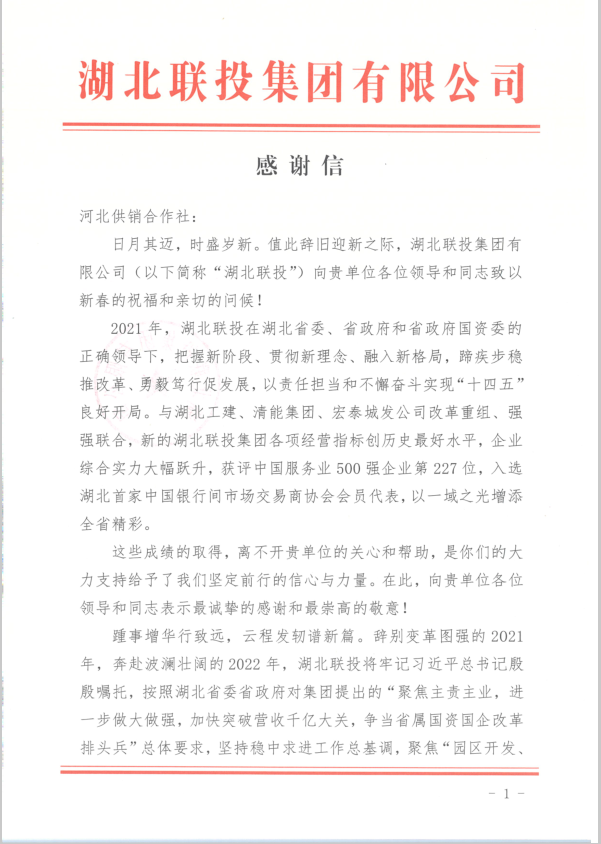 本網(wǎng)訊 1月28日,湖北聯(lián)投集團有限公司向河北省供銷合作總社發(fā)來感謝信,對雙方良好的合作表示高度贊揚,對河北省供銷社以往的大力支持表示衷心的感謝并致以新春的問候。作為河北省供銷系統(tǒng)龍頭企業(yè),河北省農(nóng)資集團今后將與湖北聯(lián)投集團進一步加強業(yè)務(wù)合作,拓展合作空間,實現(xiàn)合作項目的量級突破,強強聯(lián)手,互利共贏,共同創(chuàng)造新的輝煌。