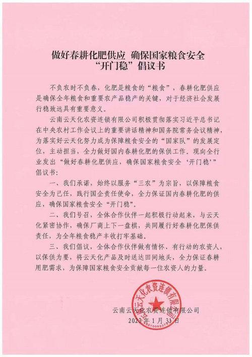 近日,云南云天化農(nóng)資連鎖有限公司向全國(guó)發(fā)出《做好春耕化肥供應(yīng)確保國(guó)家糧食安全“開門穩(wěn)”倡議書》。作為云天化的戰(zhàn)略合作伙伴,我們深表贊同并積極響應(yīng)。春耕在即,作為河北省農(nóng)資保供重點(diǎn)企業(yè),河北省農(nóng)資集團(tuán)將與云天化共同行動(dòng),全力保證春耕的用肥需求,為全省的農(nóng)業(yè)生產(chǎn)貢獻(xiàn)力量。