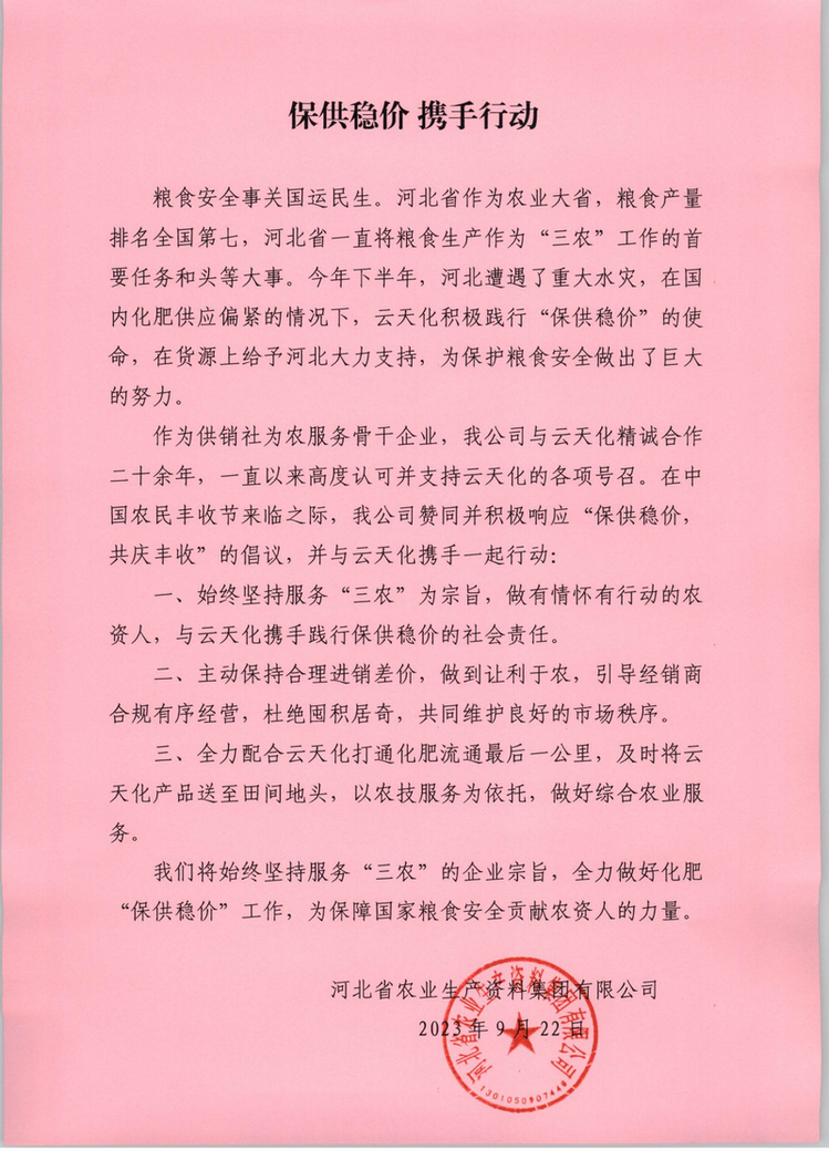 作為供銷社為農(nóng)服務(wù)骨干企業(yè),我公司與云天化精誠合作二十余年,一直以來高度認(rèn)可并支持云天化的各項(xiàng)號召。在中國農(nóng)民豐收節(jié)來臨之際,我公司贊同并積極響應(yīng)“保供穩(wěn)價,共慶豐收”的倡議,并與云天化攜手一起行動,我們將始終堅(jiān)持服務(wù)“三農(nóng)”的企業(yè)宗旨,全力做好化肥“保供穩(wěn)價”工作,為保障國家糧食安全貢獻(xiàn)農(nóng)資人的力量。